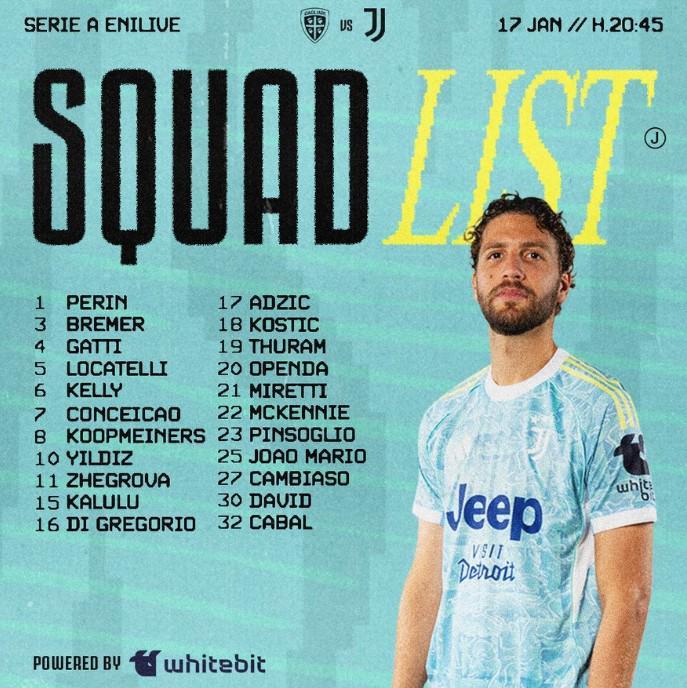 尤文客战卡利亚里大名单:洛卡特利领衔,米利克继续伤缺
